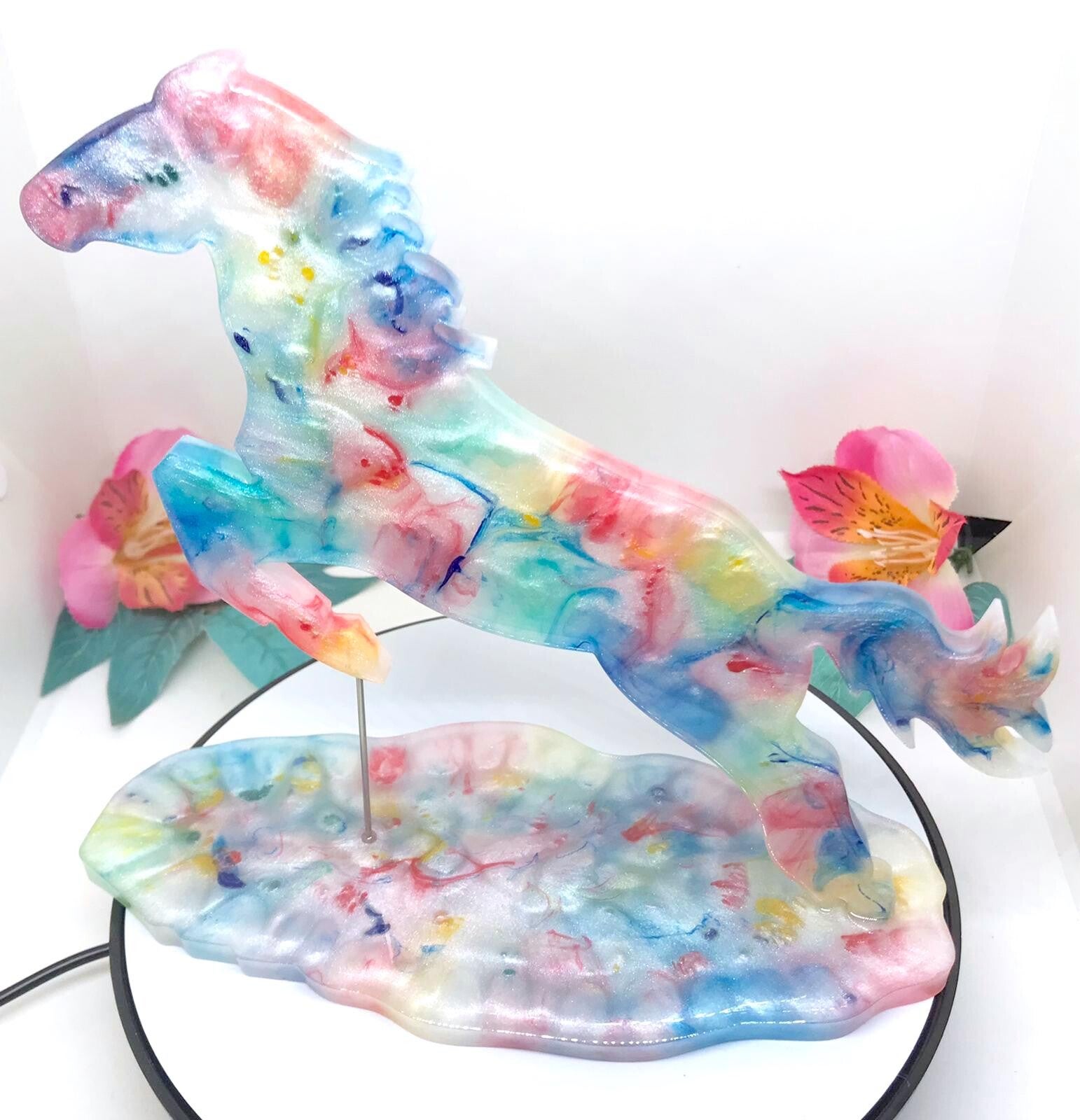 Si vous êtes à la recherche d'une pièce de décoration unique et captivante qui évoque la beauté et la magie de la peinture aquarelle, cette sculpture en résine d'un cheval multicolore est faite pour vous.